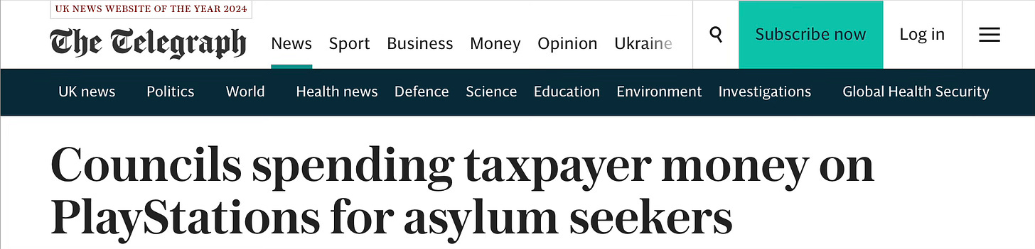 The Telegraph can reveal that in 2022, the Tory-run council of West Sussex used £334 of its funding to buy PlayStation consoles and games for new arrivals in a “hotel setting”. The council also paid £496 for yoga sessions for those in hotels.