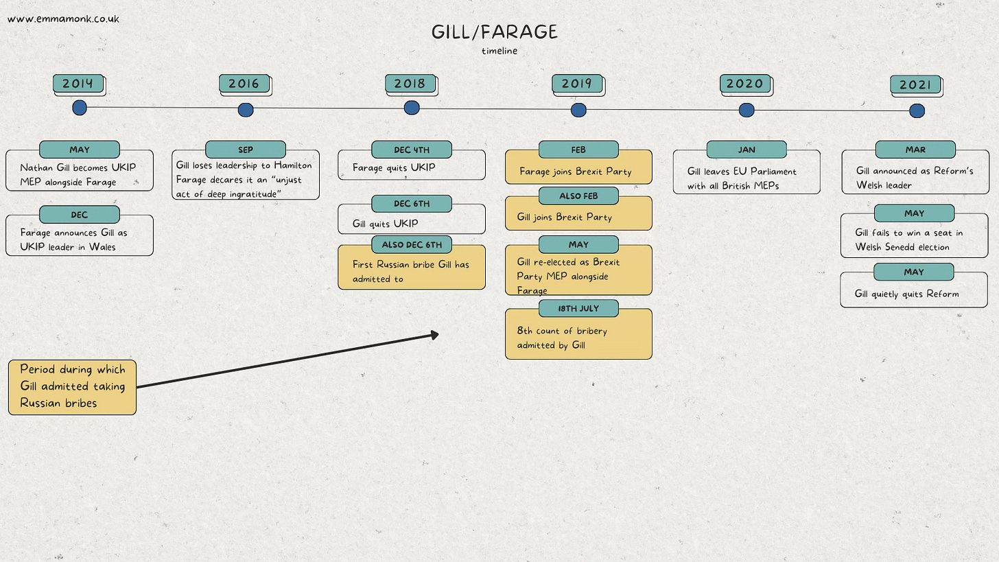The first admitted count of bribery began the day Gill followed Farage out of UKIP and continued while he was in Farage’s Brexit Party.