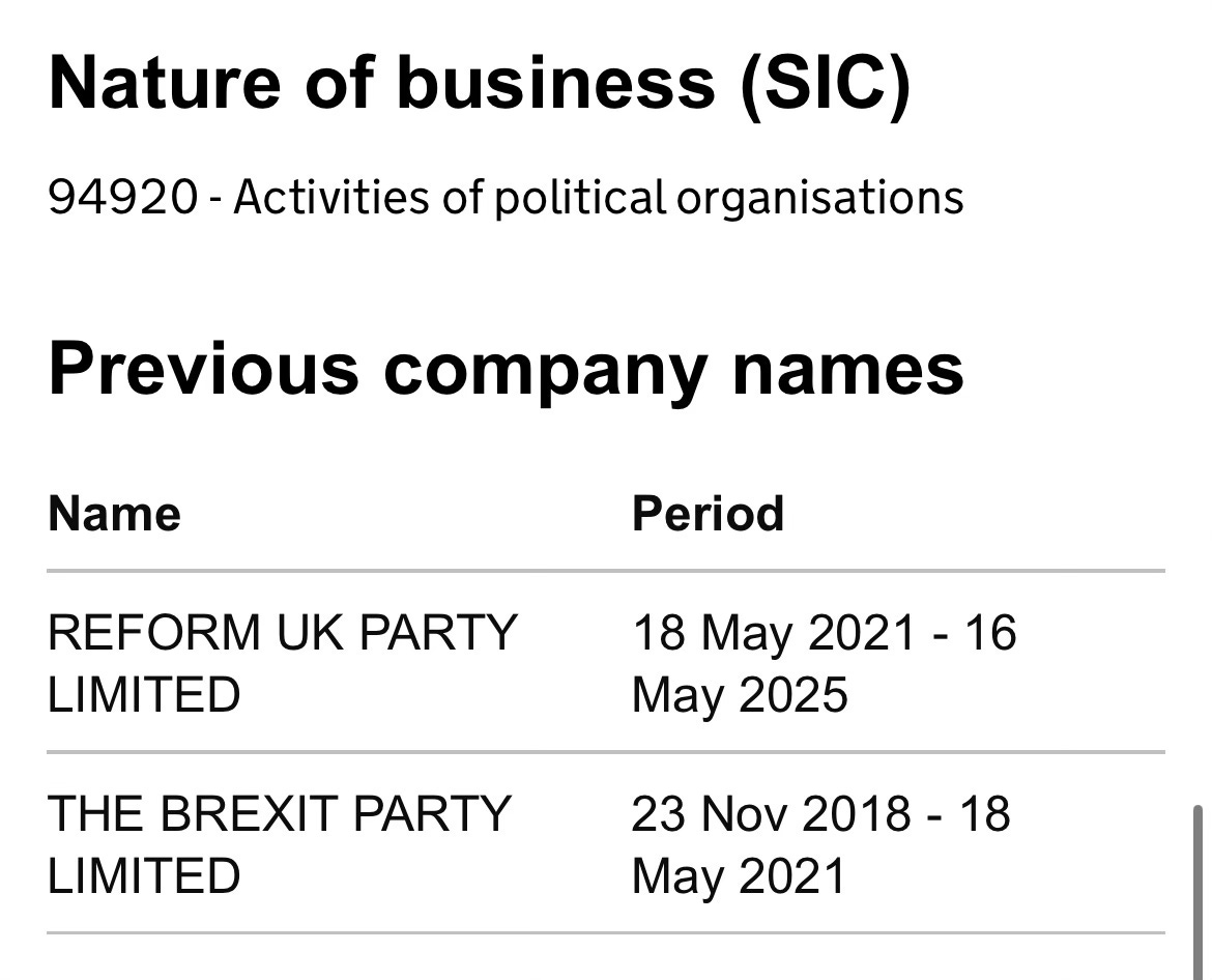 In May 2021, “The Brexit Party Limited” changed its name to “Reform UK Party Limited” with Companies House.